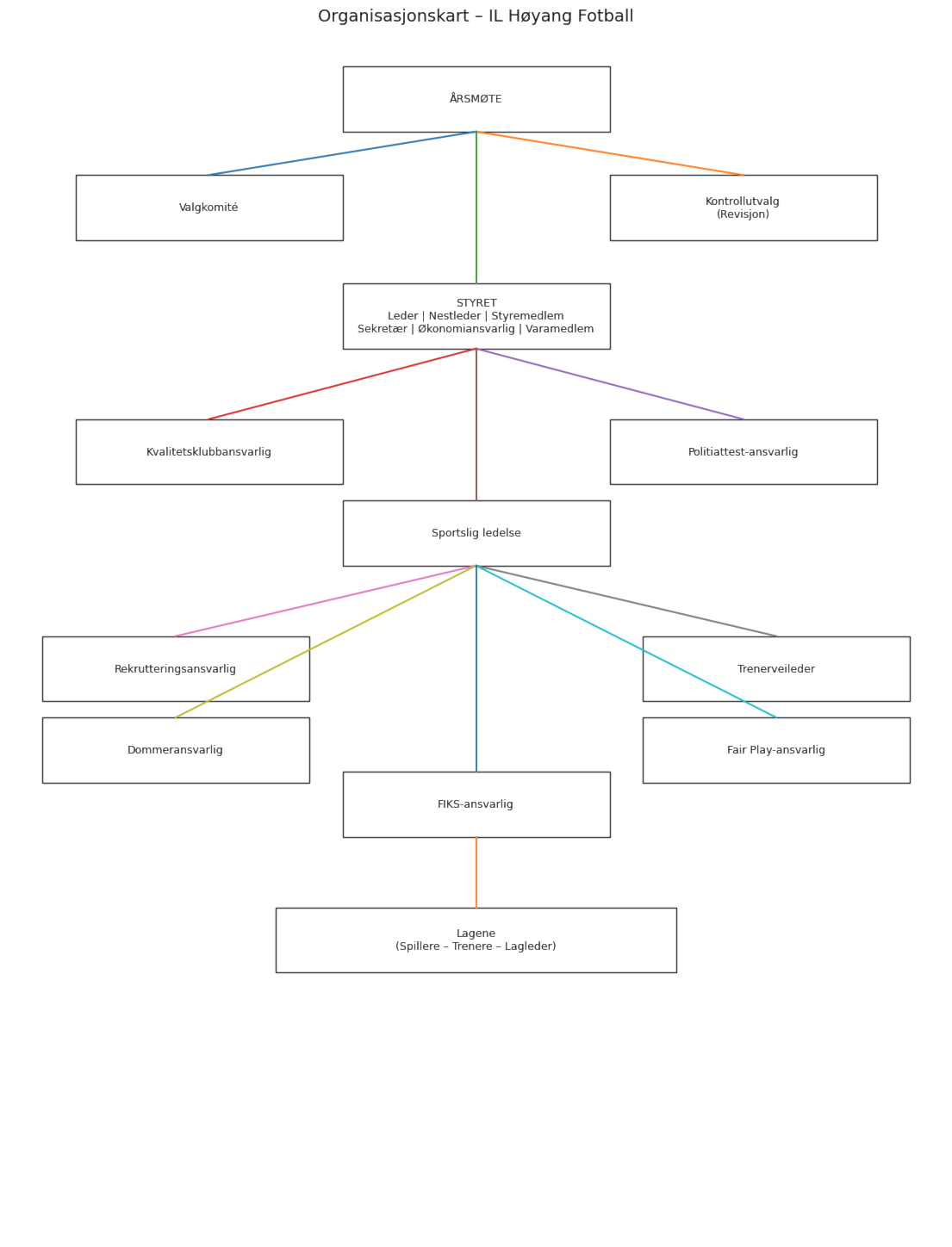 Organisasjonskartet viser klubbens struktur fra årsmøtet, via styret og nøkkelroller, ned til den enkelte lagsenhet (spillere, trenere og lagledere).